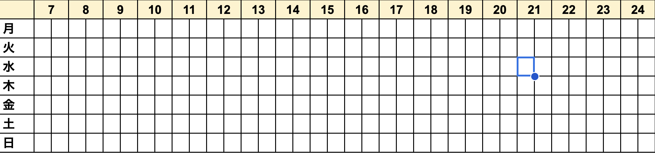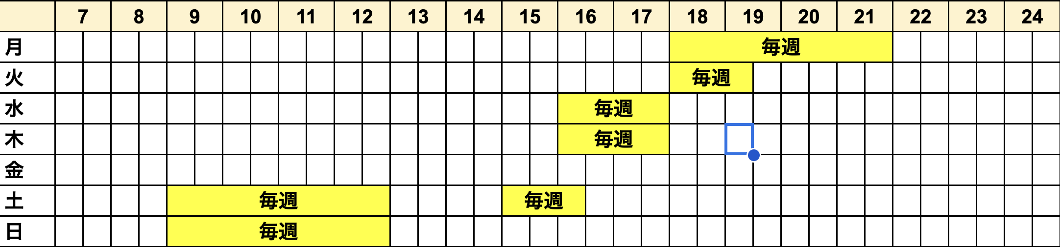 以下の表が定期予約されている枠です。(2025年9月〜)